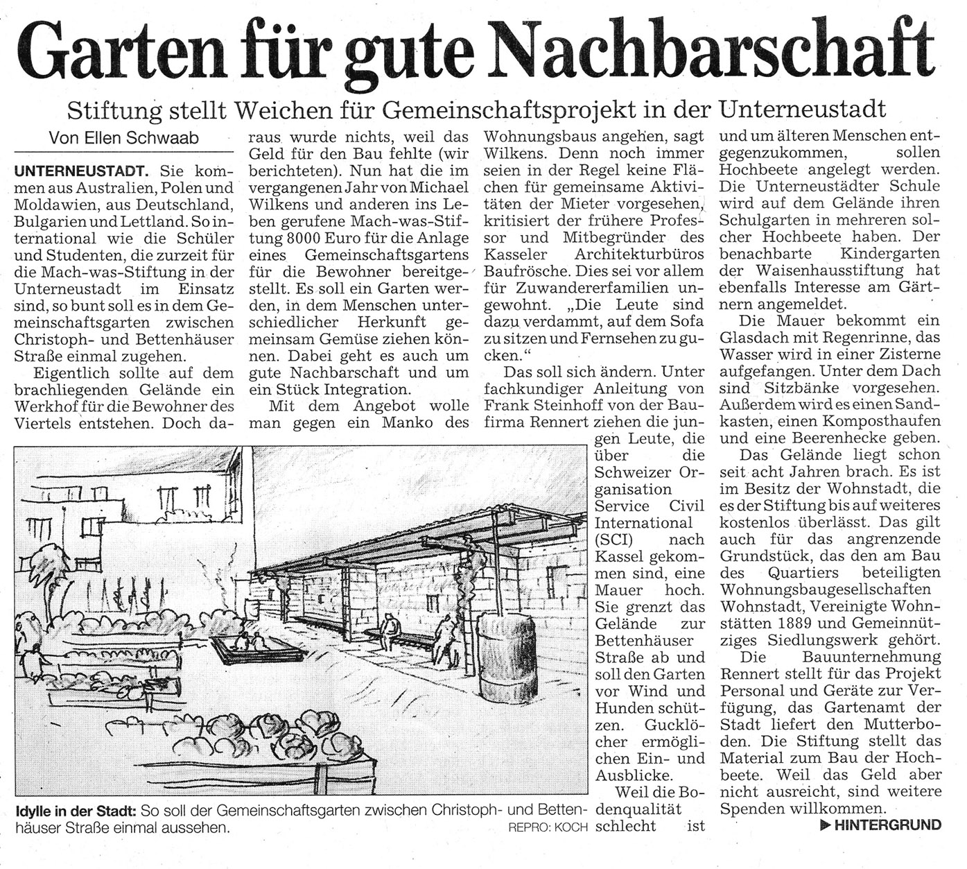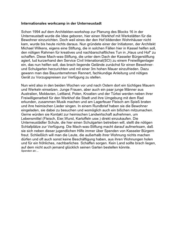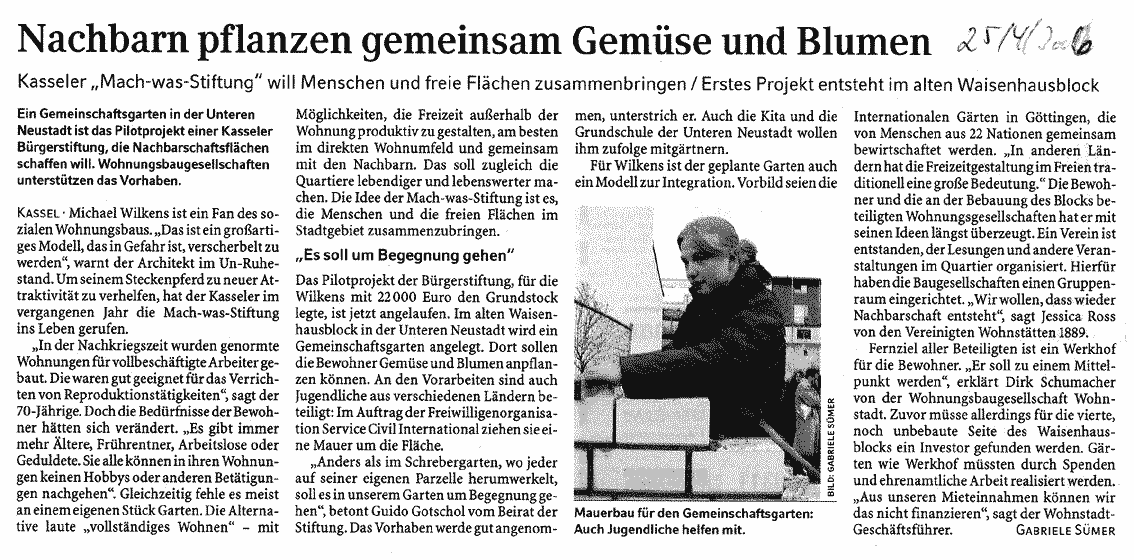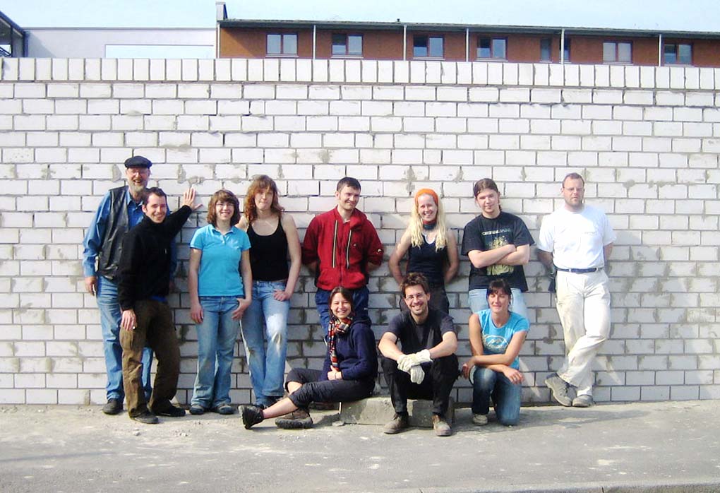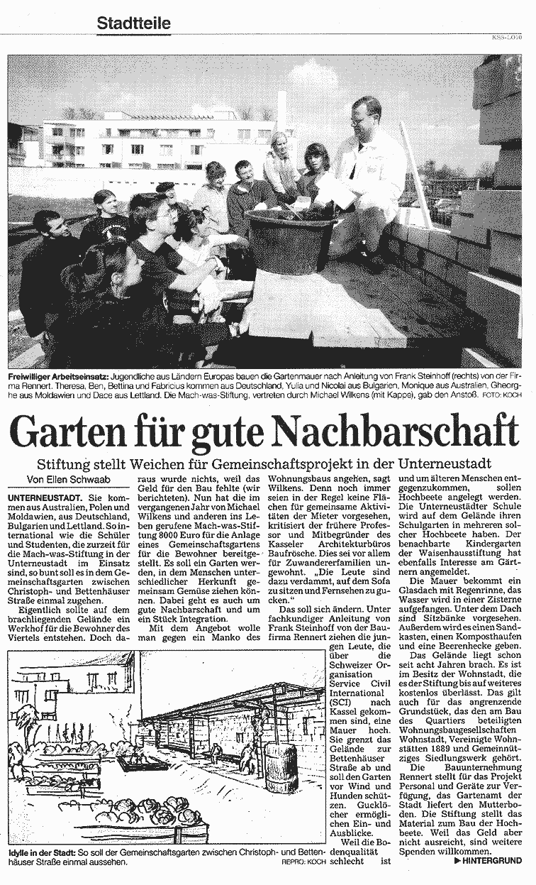 Gartenmauer fertiggestellt! Vom 9. bis 22. April 2006 veranstaltete der Service Civil International SCI mit 14 Freiwilligen aus vorwiegend osteuropäischen Ländern auf dem Gelände des zukünftigen Werkhofes in der Unterneustadt ein Jugendlager. Mit kompetenter Unterstützung durch die Kasseler Baufirma Rennert brachten die Freiwilligen das Pilotprojekt der Mach-was-Stiftung voran und bauten die Gartenmauer auf, um die temporär für Hochbeete und Gemeinschaft stiftende Aktivitäten zu nutzende Brachfläche für die Nachbarschaft zu sichern. Die Jugendlichen kampierten in der Turnhalle der Unterneustädter Schule und wurden in der Mensa der Uni verpflegt. Die Bewohner der Unterneustadt unterstützten die Helfern mit Kaffee, Kuchen und Grillwürstchen und bescherten den Freiwilligen zum Abschluss der Bauarbeiten ein schönes Fest.