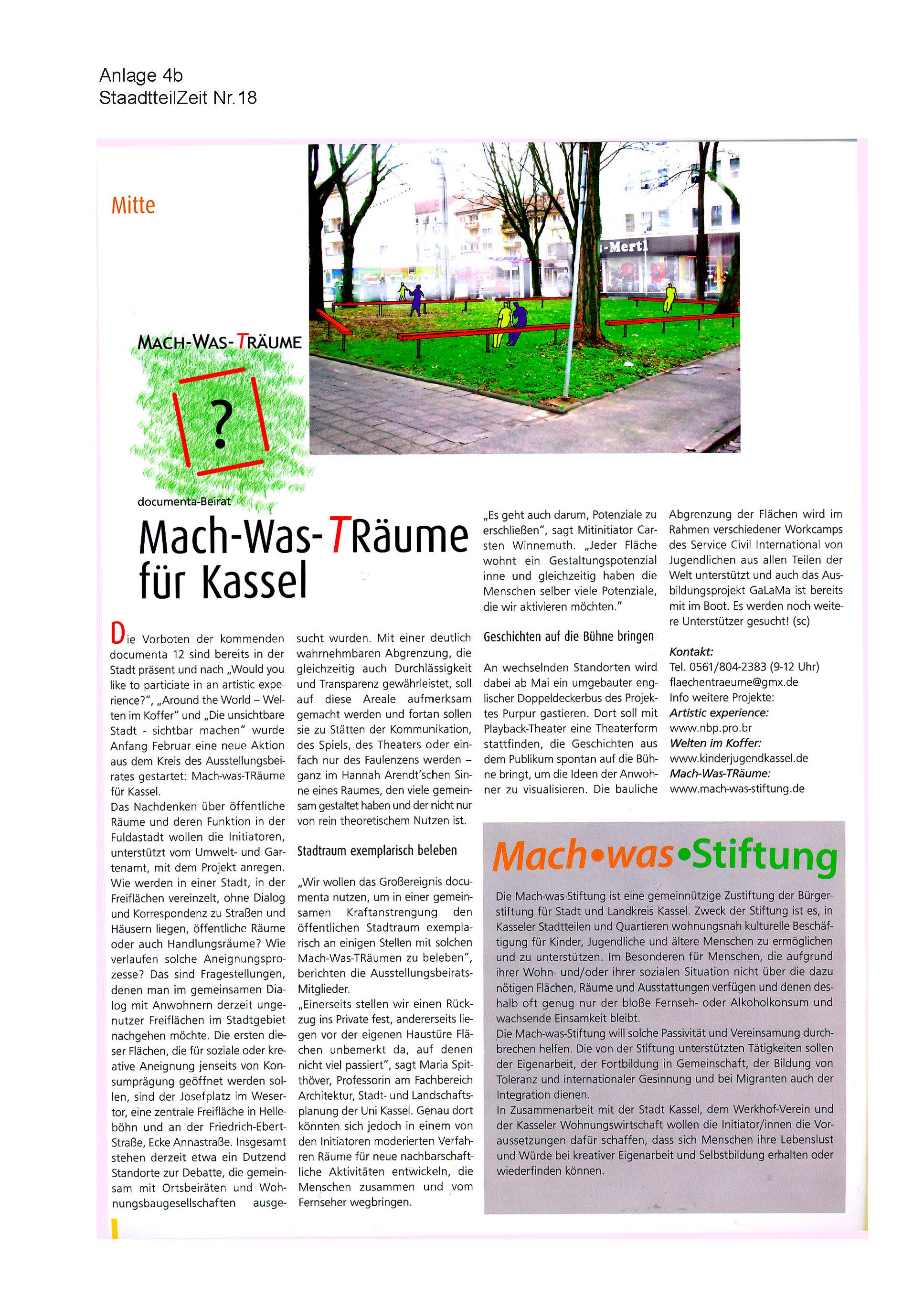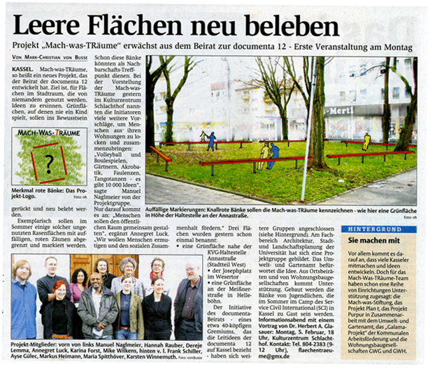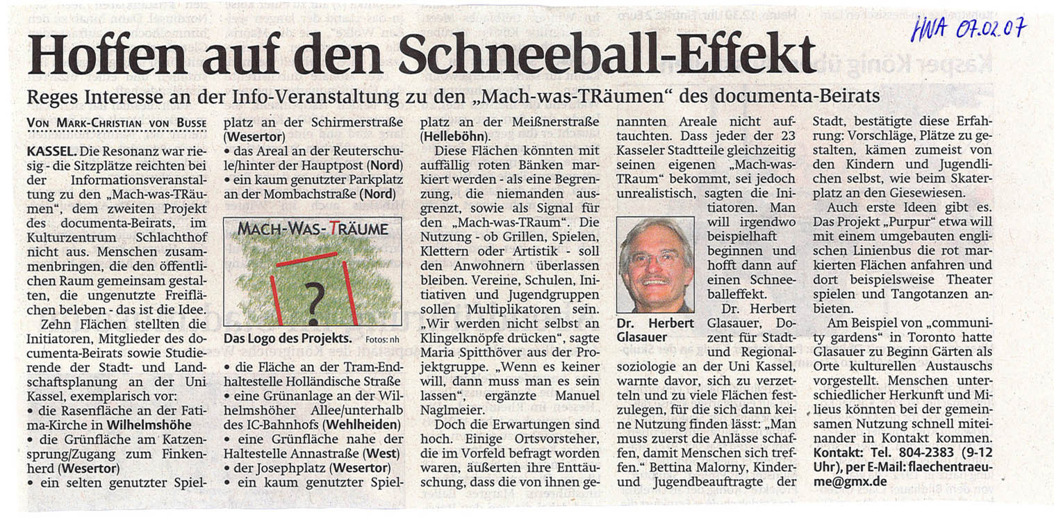 Also los! Wenn Sie Ideen haben oder mithelfen wollen, rufen Sie an oder schreiben Sie uns: Tel (9-12 Uhr): 804-2383 oder flaechentraeume@gmx.de. Spenden auf das Sonderkonto bei der Bürgerstiftung für die Stadt und den Landkreis Kassel